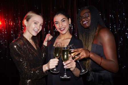 Portrait of three elegant young women holding champagne glasses and smiling at camera while posing against sparkling background at party, shot with flash