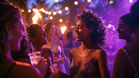 Night party on a terrace. Happy women having fun under confetti.