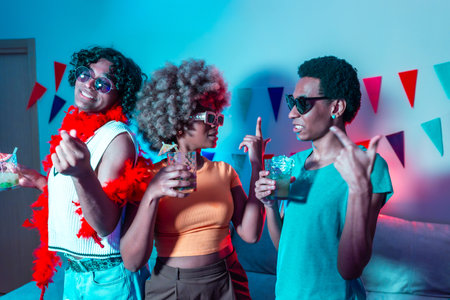 Three young women laughing and dancing, celebrating a festive new year's eve or costume party at home, wearing fun accessories and drinking cocktails in a lively atmosphere
