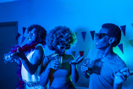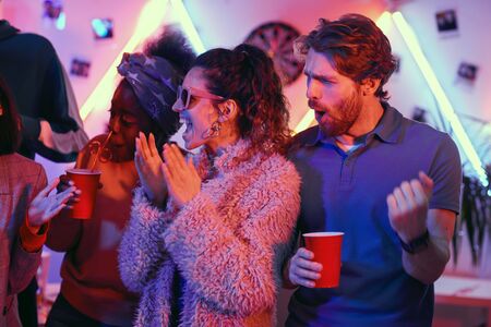 Multi-ethnic students partying at home at night with colorful neon light illuminating the apartment