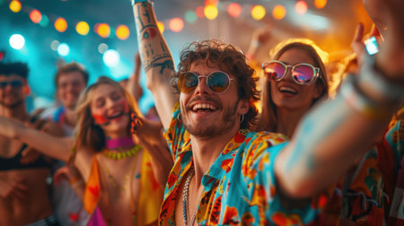 A group of young adults in vibrant and extravagant clothing at an electronic music festival, dancing under the open sky with laser light shows.