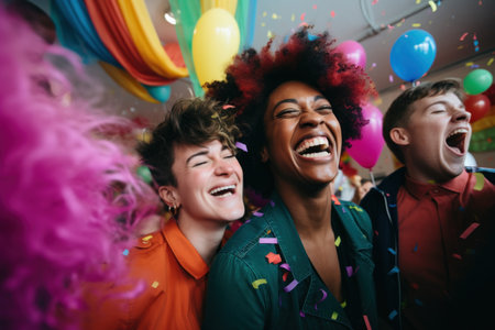 A diverse group of people are laughing and celebrating, showered with confetti. The scene displays a warm, inviting interior, possibly a social gathering indoors. Soft lighting creates an atmosphere of excitement and festivity. Suitable for various uses including advertising and editorial content.