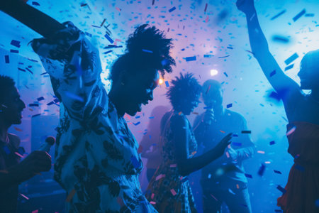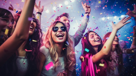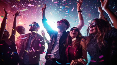 A lively dance party takes place in a club filled with colorful confetti flying through the air. People dance joyfully under bright lights on a Saturday night.