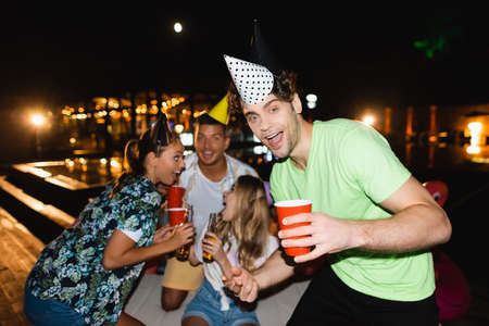 Selective focus of young man in party cap holding disposable cup near friends during party at night