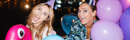 Its going down. Cropped shot of a diverse group of young friends having fun with balloons at a party at night.