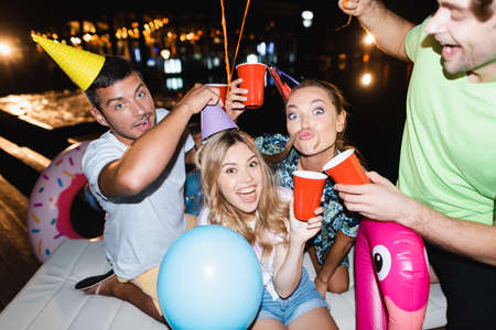 Selective focus of young friends in party caps having fun and holding disposable cups at night
