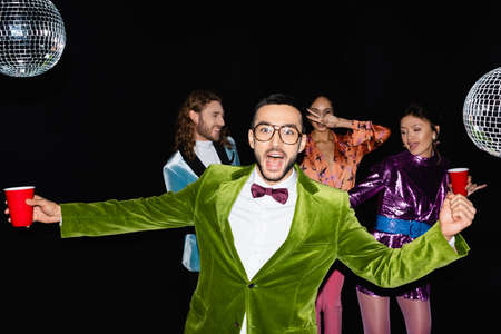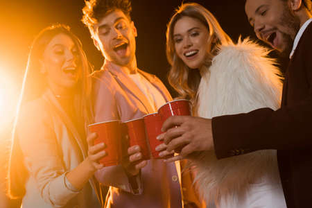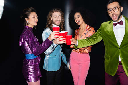 positive multiracial friends in colorful clothes drinking from plastic cups in night club on black background