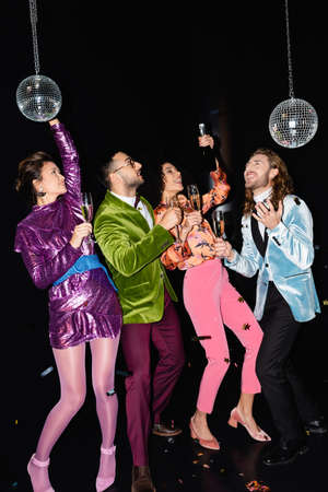 positive multiracial friends in colorful clothes dancing with champagne in night club on black background