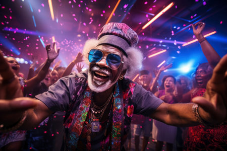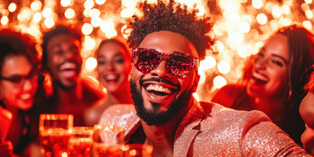 A joyful Black man wearing stylish glasses beams with happiness at a lively party, surrounded by colorful confetti and festive lights, embodying the spirit of celebration and togetherness.