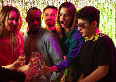 Cheerful friends hanging out together, celebrating holiday and having fun. Clinking glasses
