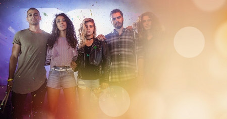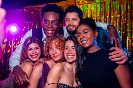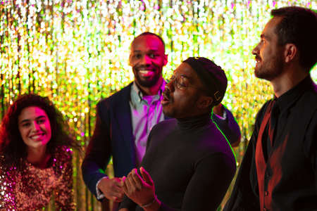 Group of cheerful elegant friends posing together for a photo at nightclub party with disco lights and gold tinsel curtain backdrop