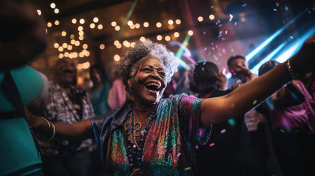 A bright and energetic photo of people dancing in a club. The scene captures their joyful expressions as they dance to the music at a disco. The atmosphere is filled with energy and excitement, showing a variety of characters enjoying a nightclub party.