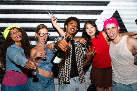 confetti party Multiethnics happy young people group celebrating new year eve while dancing and have fun at home