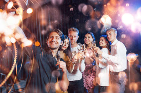 A cheerful group of friends enjoy new year party at nightclub People are drinking, dancing and having a good time at the party comeliness.