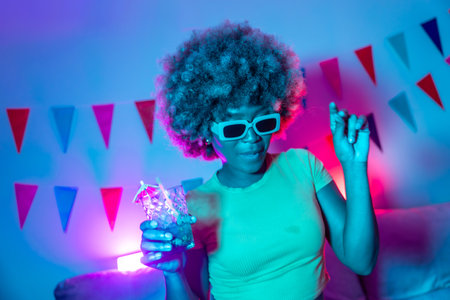 Cool african woman with sunglasses dancing, drinking cocktail and partying at home