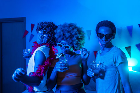 Three young women laughing and dancing, celebrating a festive new year's eve or costume party at home, wearing fun accessories and drinking cocktails in a lively atmosphere