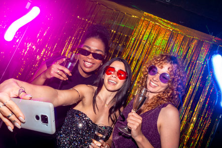 Three multi ethnic female friends are taking a selfie while enjoying sparkling wine at a nightclub, celebrating with neon lights and a gold foil curtain