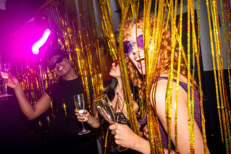 Young women enjoying a vibrant disco party, holding sparkling wine glasses and posing behind shimmering golden curtains