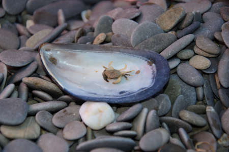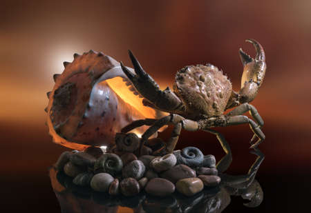 Still life of sea stones, shells and crab, on a beautiful background.
