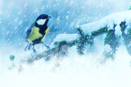 Tit sitting on spruce branches covered with snow in winter