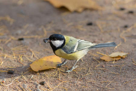 tit with seeds on the ground in the fall