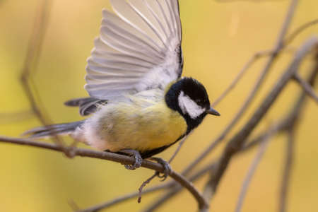 Tomtit is flying, autumn in Siberia, Tomsk