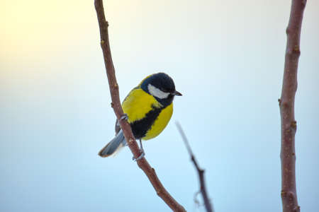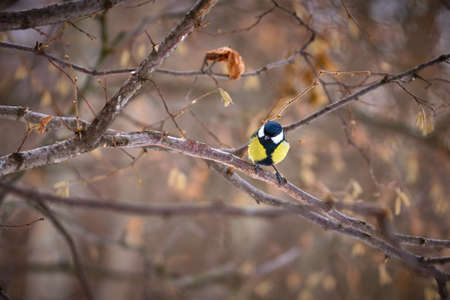 Cute bird Great tit, songbird sitting on a branch without leaves in the autumn or winter. Parus major