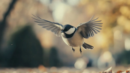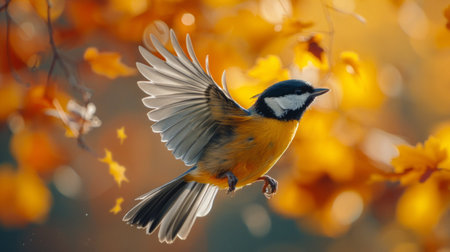 Bird in flight with autumn leaves in the background, capturing the beauty of nature