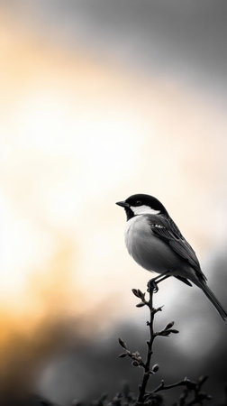 A single bird perched on branch, showcasing elegance against soft sunset
