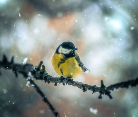 Yellow great tit in winter forest. Close up of a wild bird.