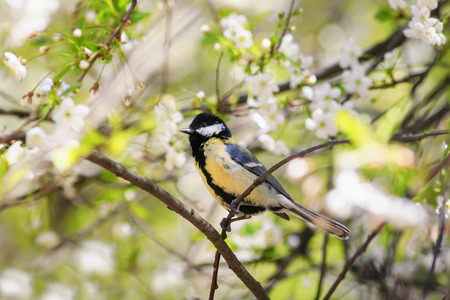 cute bird tit sings a beautiful song in spring garden on branch in may flowers