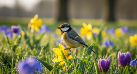 Bird perched on a daffodil in a flower meadow
