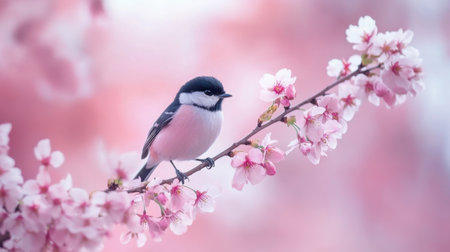 A tiny bird perched on a blooming cherry blossom branch, highlighting the delicate beauty of springtime.