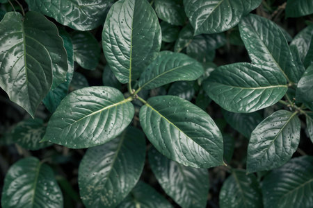 Closeup view of natural green bush leaves in dark forest