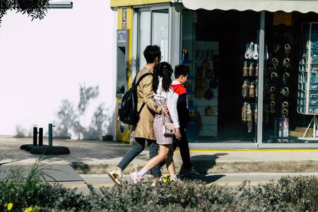 Paphos Cyprus March 06, 2020 View of unidentified tourist walking in the streets of Paphos in the afternoon