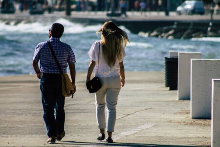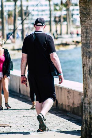 Limassol Cyprus March 13, 2020 View of unidentified tourist walking in the streets of Limassol in the afternoon