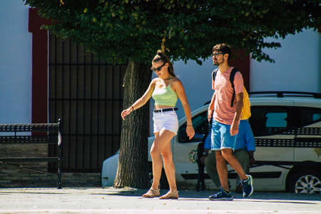 Carmona Spain July 26, 2021 Pedestrian walking in the streets of Carmona during the coronavirus outbreak hitting Spain, wearing a mask is not mandatory but most of people wear it