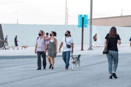 Barcelona, Spain: 2020 02 Sept: People walk in the street in the Forum in Barcelona in summer 2020.