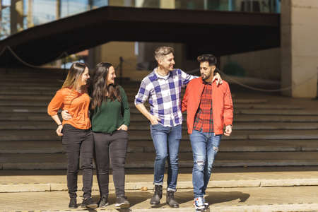 Group of young people walking in the city and using mobile phones.