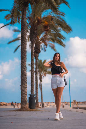 Summer lifestyle, portrait of a young brunette Caucasian woman with white shorts and black t-shirt on the Mediterranean coast next to some palm trees