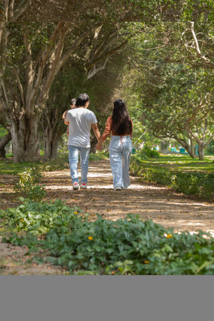 Back view parents and teen daughter walking at boardwalk, punta del este city, Uruguay
