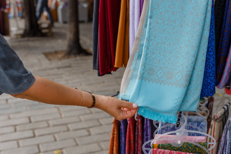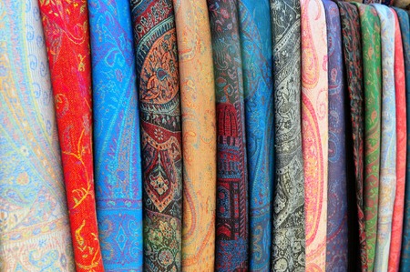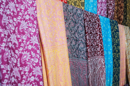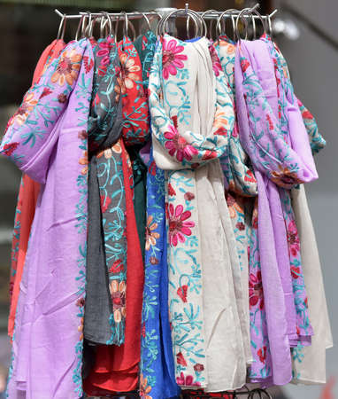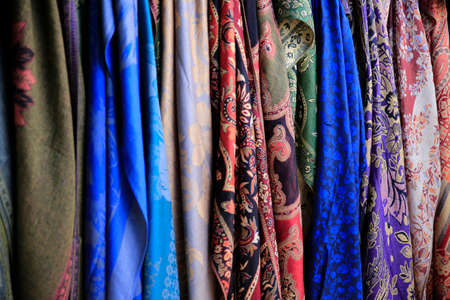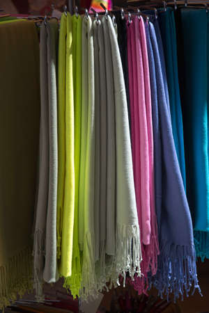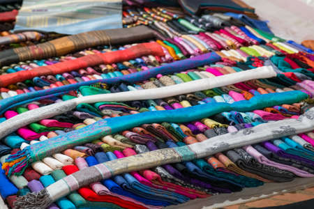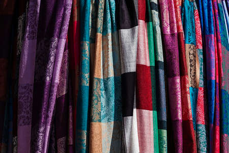 Colorful scarves or shawls for sale at market or fair. Colored fabric background.