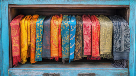 A stunning array of handcrafted scarves displayed in an antique wooden cabinet, showcasing vibrant colors and intricate patterns that highlight cultural craftsmanship.
