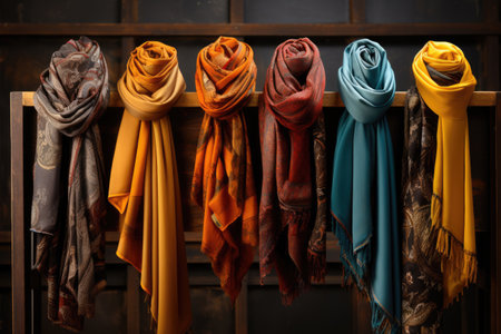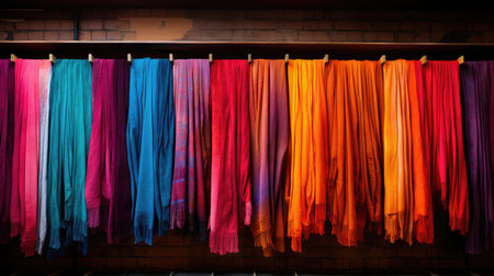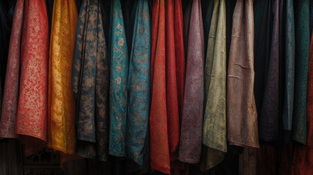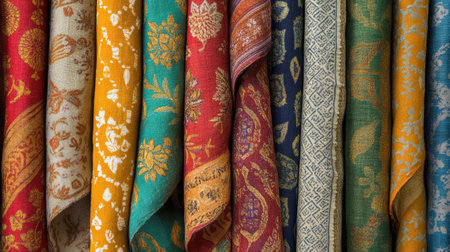 A stunning display of colorful textiles with intricate patterns, perfect for showcasing fashion design or enhancing interior decor with vibrant elegance.