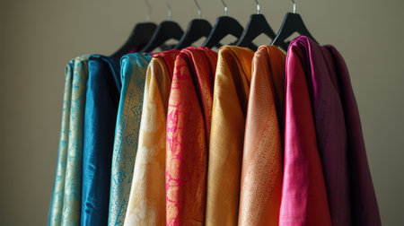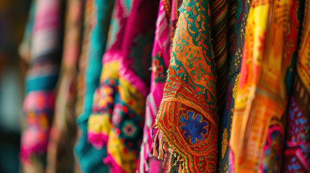 Colorful ethnic garments hanging, rich textures, detailed closeup