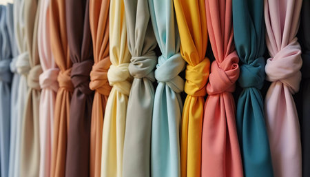 Intricately tied curtain knots hang gracefully in a textile shop, displaying a vibrant array of colors, patterns, and textures in the afternoon light. Generative AI.
