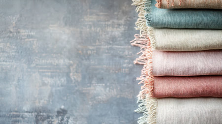 A collection of neatly folded fabrics in various pastel colors sits against a textured background showcasing different textures and hues.
