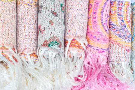 Tradition scarf handmade colorful cotton texture in souvenir shop close up