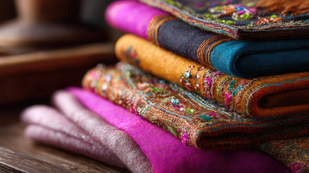 This image showcases a vibrant stack of beautifully embroidered textiles arranged on a rustic wooden surface, highlighting intricate patterns and colors.