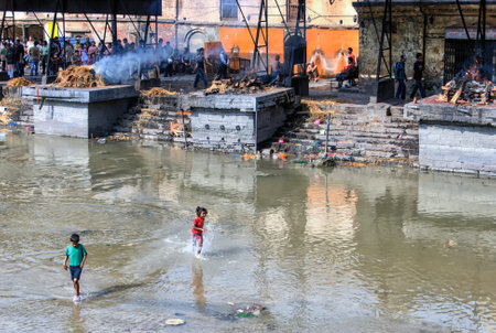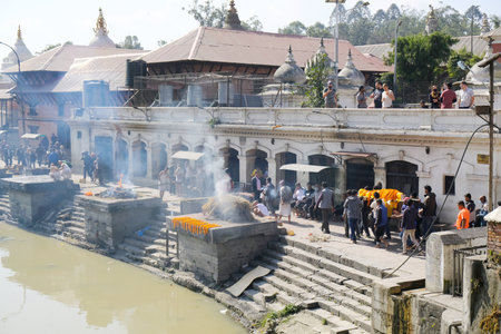 Kathmandu, Nepal- April 20,2019 : Hindu People Cremating dead bodies according to hindu rituals at Bagmati River Pashupatinath Temple premises in Kathmandu.